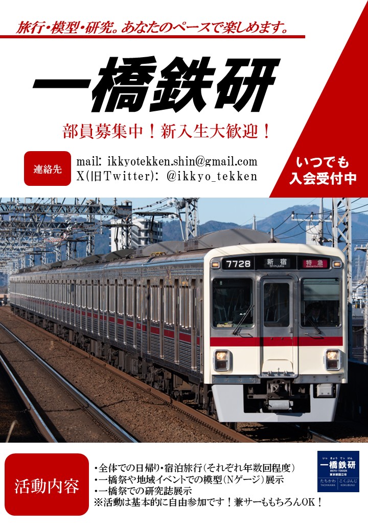 - 一橋鉄研は通年部員を募集しています。入部・見学希望は公式XのDMまたは ikkyotekken@yahoo.co.jp (@を全角から半角へ)までお問い合わせください!