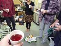 ▲結局、全作業が完了する頃には、すでに日付が変わっておりました。部員たちも、この突貫作業には流石に疲れを隠し切れない様子でしたが、何はともあれようやく研究誌の完成です。このように、冊子として出来上がった姿を見ると、これまでの苦労も報われるというものです。というわけで、その場にいた一同で乾杯。